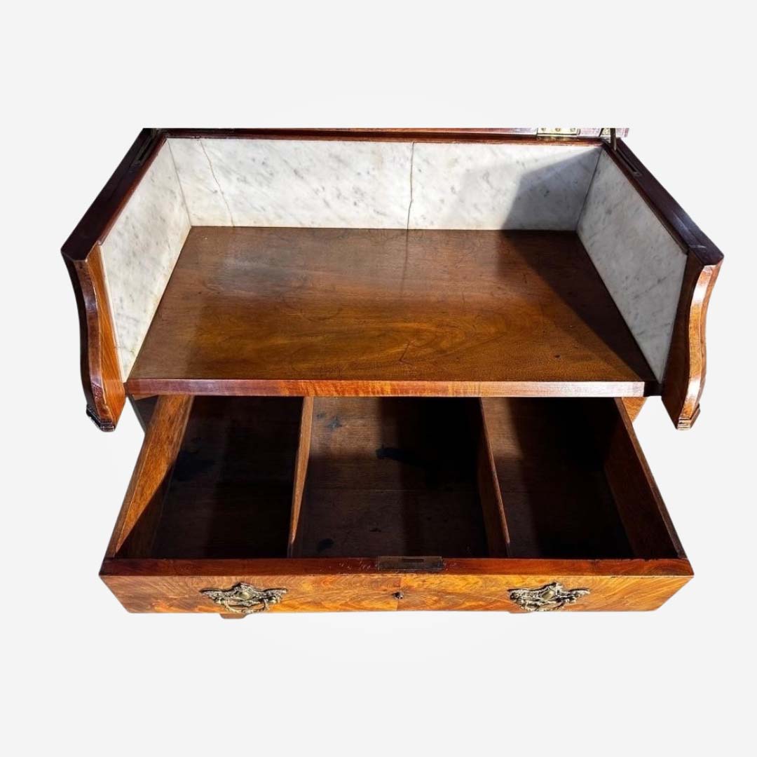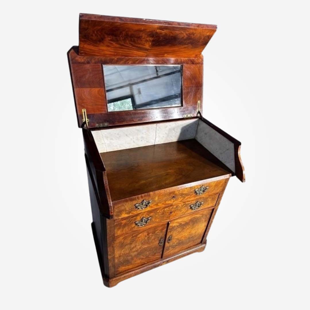 This antique 19th-century cabinet features a prominent bombe shape, highly figured burr walnut veneer, and decorative brass rococo-style hardware. The lift-top suggests it may have been used as a vanity.